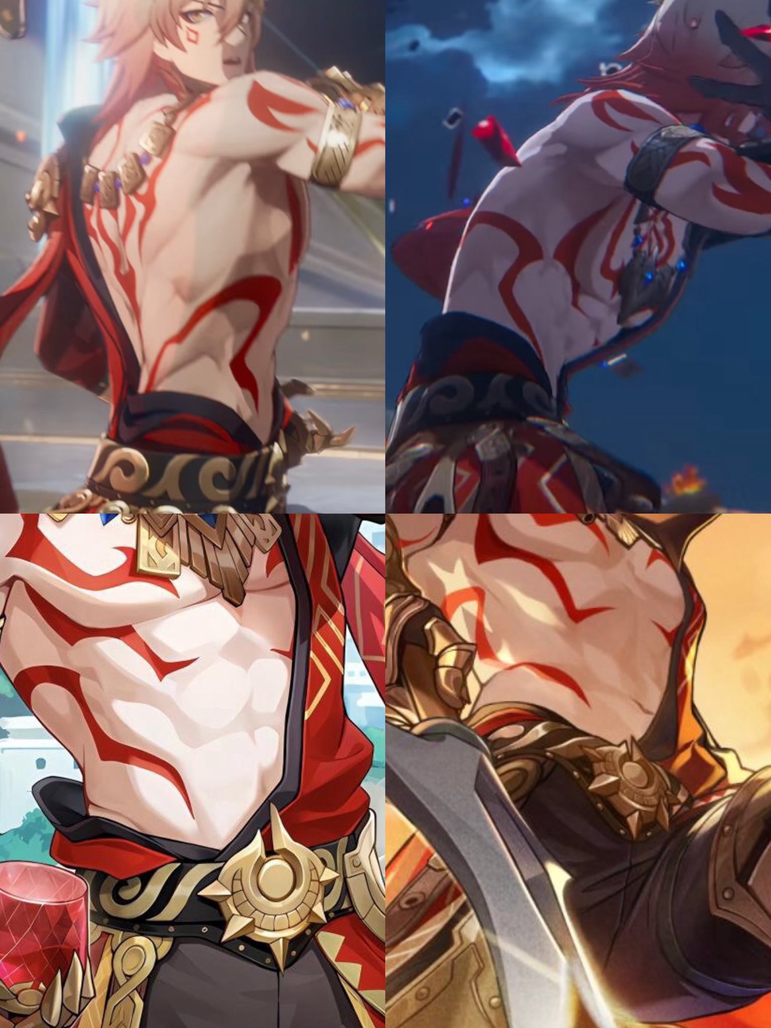 form-fitting/flattering button-up shirts, tank tops, and generally stylish but comfortable clothing, mostly in red, black, or white. he has a good enough sense of style to know what looks good on him, though he leans toward simple clothes with few layers. he does like jewelry though, specifically gold and sapphire.out of character